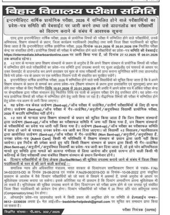 यदि आप भी बिहार बोर्ड के द्वारा इंटरमीडिएट की वार्षिक परीक्षा 2026 में देने वाले हैं तो उससे पहले बिहार बोर्ड के द्वारा आपकी कॉलेज में प्रैक्टिकल परीक्षा का आयोजन होने जा रहा है जिसका शुभारंभ 10 जनवरी 2026 से लेकर 20 जनवरी 2026 के बीच आयोजित होने वाली है जिसमें सभी परीक्षार्थी को शामिल होना आवश्यक है जिसका एडमिट कार्ड बिहार बोर्ड के अध्यक्ष आनंद किशोर जी के द्वारा 27 दिसंबर 2025 को जारी कर दिया गया है और आप उसे 9 जनवरी 2026 तक डाउनलोड कर सकते हैं।